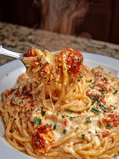 Cheesy Spaghetti in Garlic Parmesan & Cream Cheese Tomato Sauce