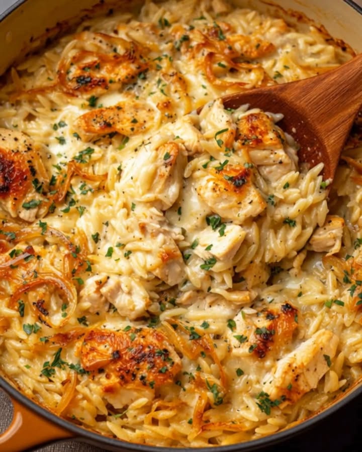 A creamy and flavorful one pot chicken orzo casserole that is easy to make and perfect for a family meal.