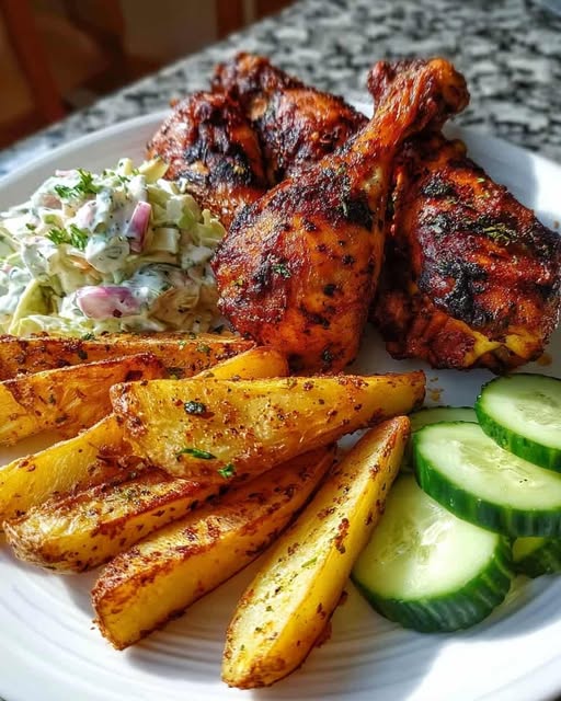 Plate chicken with wedges, coleslaw, and fresh cucumber slices—this creates a balanced comfort plate, family dinner favorite, and restaurant-style meal at home.