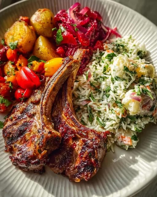 Arrange lamb, rice, salad, and potato mix for a balanced dinner plate, hearty meal combo, next-level comfort food.
